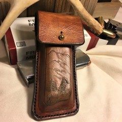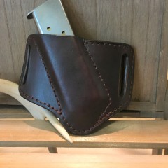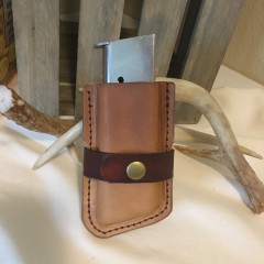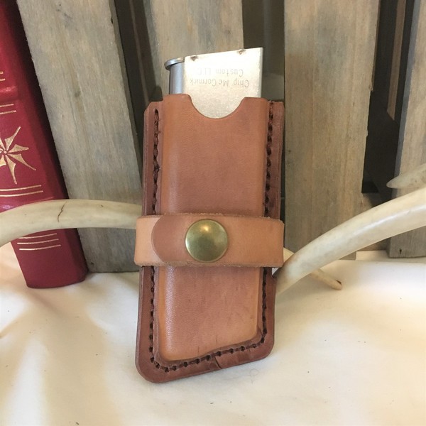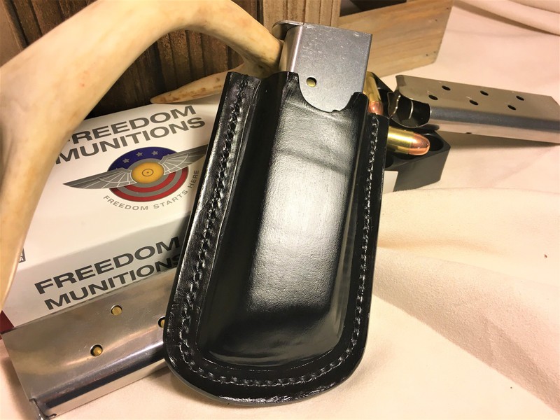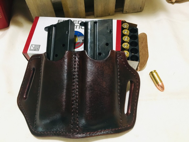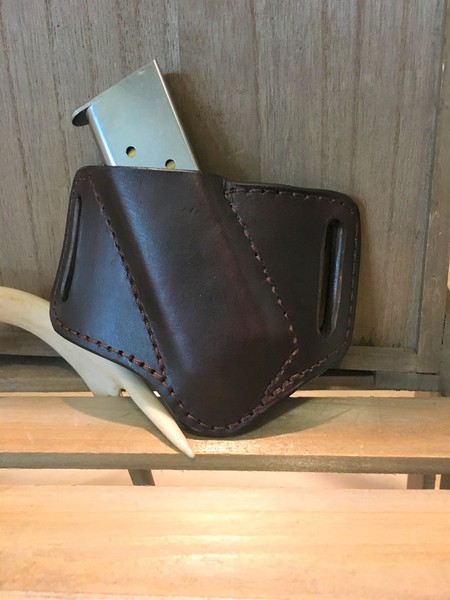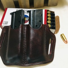 All pouches are handmade and tailored to the specific magazines. They can be designed for belt or rifle strap carry. and can be constructed with or without restraining straps or flaps. For retaining strap and flap versions, you can select snaps or "Sam Browne" button studs.
